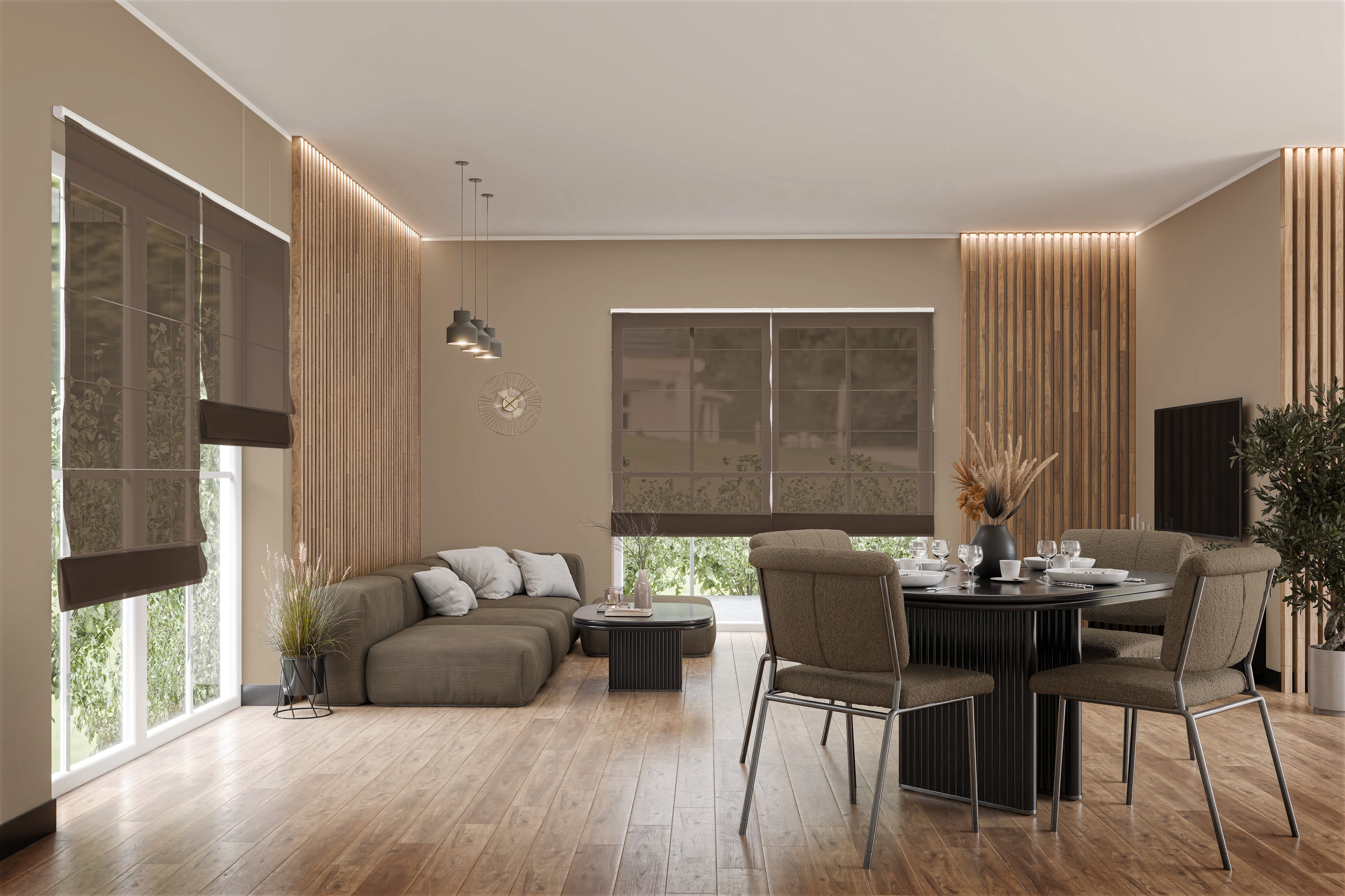 Das Raffrollo Amarico 9357 richtet sich an Interieurliebhaber, die textile Fensterlösungen mit Charakter suchen. Sein Farbton Nussbraun wirkt tief, warm und eignet sich hervorragend für Einrichtungen, die auf Erdigkeit, Wertigkeit und Beständigkeit setzen. Besonders gut lässt er sich mit dunklen Hölzern, Lederoberflächen oder handwerklich anmutenden Möbelstücken kombinieren. Auch moderne Einrichtungskonzepte mit reduzierter Farbpalette profitieren von diesem Raffrollo in Braun, denn es bringt Stabilität und visuelle Tiefe ein, ohne dominant zu wirken. Wenn das Tageslicht von draußen einfällt, kann es aber auch bescheiden wirken, weil das Raffrollo transparent und lichtdurchlässig ist. Der Stoff ist unter seinesgleichen verhältnismäßig schwer (199 gr/m²), aber dennoch weich und fließend. Er besteht aus einer Wollmischung mit synthetischem Anteil, was ihm einen angenehmen Griff verleiht. Die Pflege kann dabei problemlos bei 30 Grad im Schonwaschgang erfolgen. Und auch das Bügeln ist auf niedriger Temperatur (Stufe 1) möglich. Bestellen Sie jetzt gleich ein Gratis-Muster von diesem Modell und fühlen Sie selbst seine weiche, hochwertige Qualität!