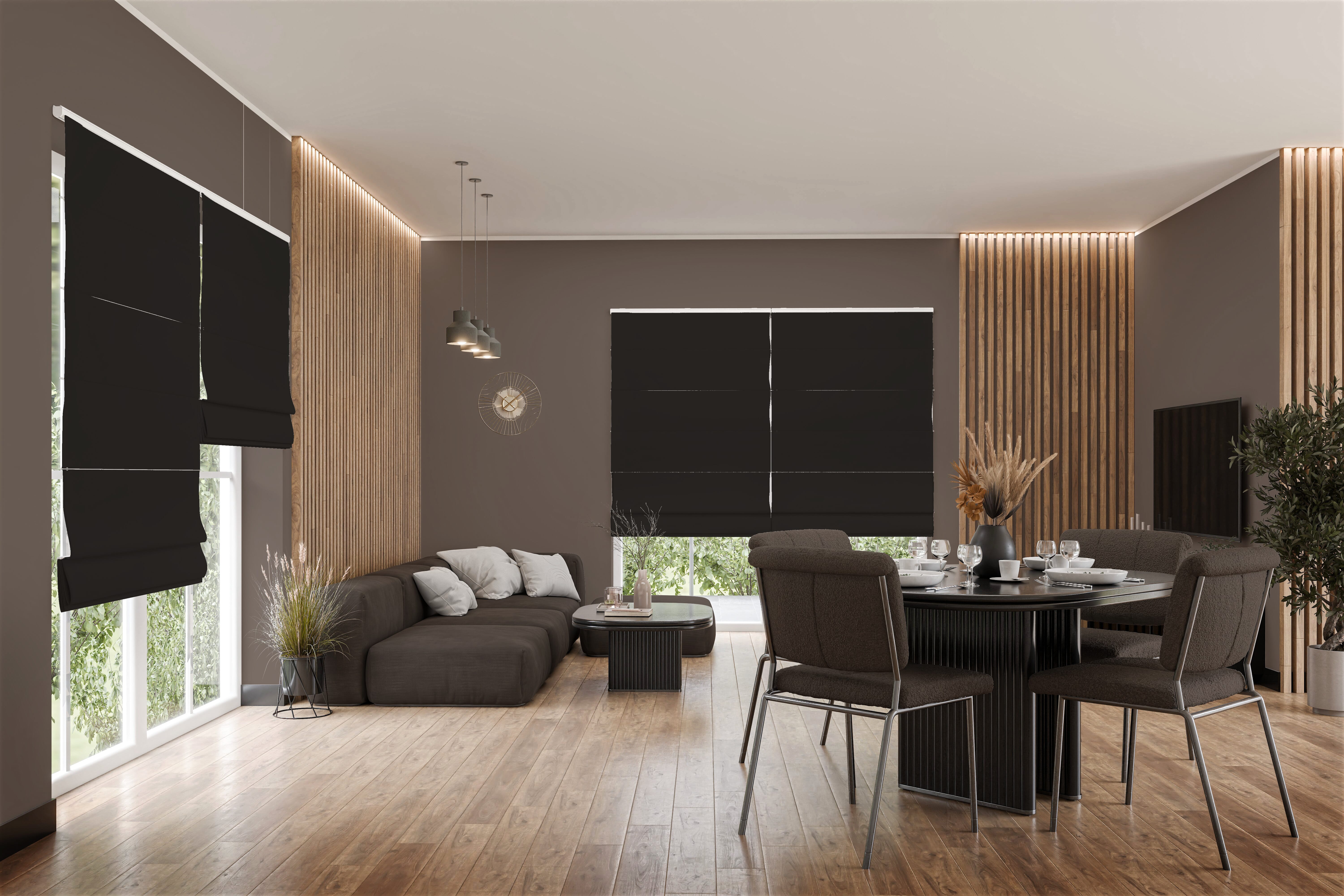 Ein tiefes Schwarz verleiht dem Raffrollo Marvella 9471 eine besonders markante Ausstrahlung. Der dunkle Farbton wirkt ruhig und kraftvoll zugleich und kann Räume auf elegante Weise strukturieren. Durch die samtartige Oberfläche erhält der Stoff eine weiche, leicht schimmernde Textur, die sich je nach Lichteinfall lebendig zeigt. In modernen Einrichtungen mit klaren Linien entfaltet das Modell eine ebenso überzeugende Optik wie in klassischen Wohnkonzepten mit warmen Holzelementen oder dezenten Naturmaterialien. Auch als kontrastreicher Akzent neben hellen Wänden oder Möbeln funktioniert das Raffrollo in Schwarz hervorragend. Gleichzeitig erfüllt der Stoff eine praktische Aufgabe: Durch seine abdunkelnde Eigenschaft reduziert er Tageslicht deutlich und schützt zuverlässig vor neugierigen Blicken, ohne dass der Raum vollständig im Dunkeln verschwindet. So entsteht eine angenehme Atmosphäre für entspannte Abende, konzentriertes Arbeiten oder ruhige Mittagsstunden auf der Couch. Damit das Raffrollo seine elegante Wirkung am Fenster vollständig entfalten kann, wird jedes Modell selbstverständlich individuell nach Maß gefertigt.