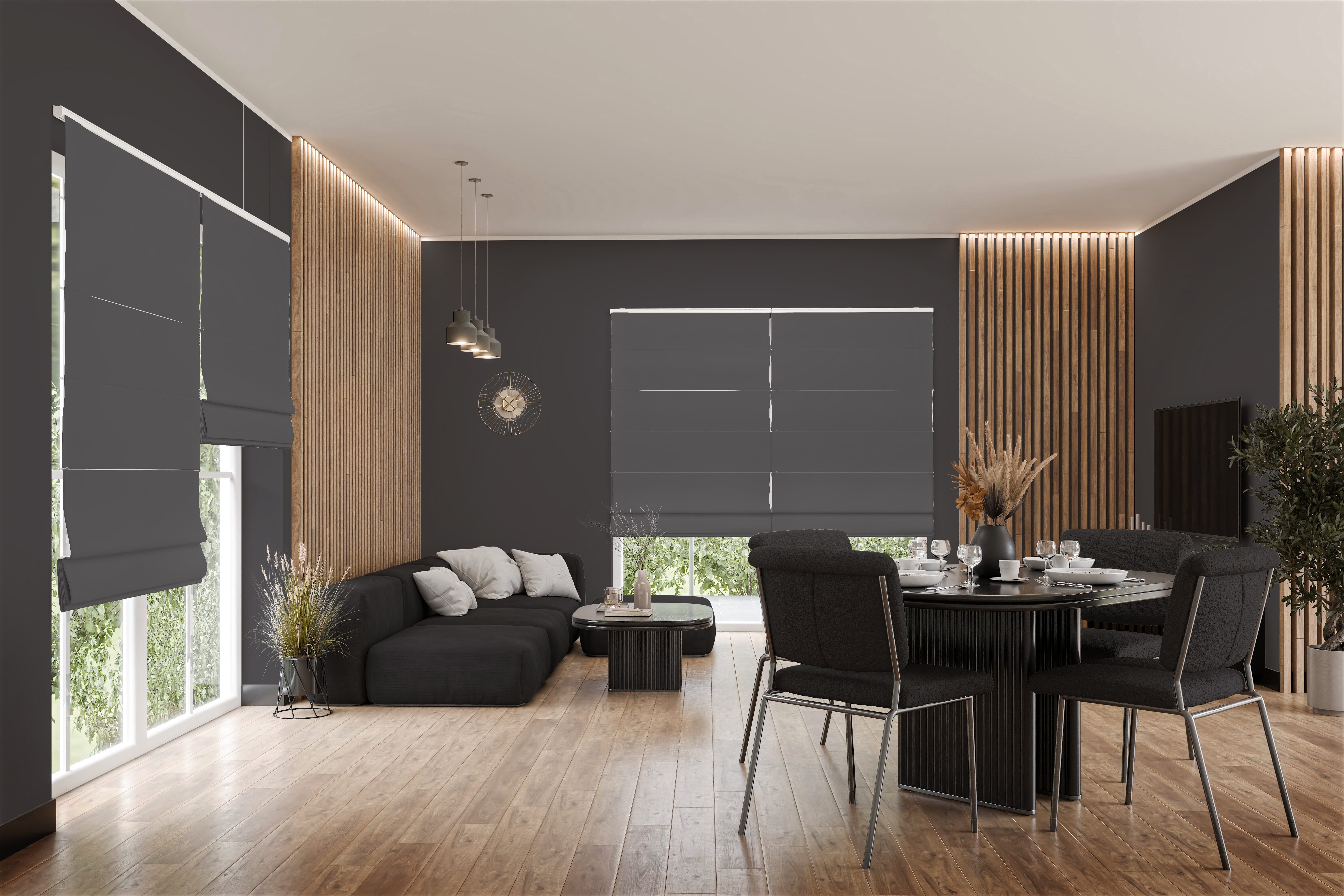 Das halbtransparente Raffrollo Meravo 9392 in Schwarzgrau bringt eine edle Nuance in Ihre Räume und erzeugt ein modernes Bild. Der neutrale, tiefe Ton eignet sich hervorragend für urbane, elegante oder Loft-Einrichtungsideen. Als Beispiele für harmonische Kombinationen dienen Möbel in dunklen Hölzern, metallische Akzente oder textile Elemente in kräftigen Farben. Der dunkle Farbcharakter wirkt dabei stets kontrolliert und bewusst eingesetzt, sodass Räume an Tiefe und visueller Ruhe gewinnen. In zurückhaltend geplanten Interieurs dient das Raffrollo in Schwarz als ruhiger Gegenpol zu hellen Wandflächen oder minimalistischen Möbeln. Gleichzeitig lässt sich die Farbe auch als verbindendes Element nutzen, um unterschiedliche Materialien und Farbtöne im Raum harmonisch zusammenzuführen. Durch seine blickdichte und gleichzeitig lichtdurchlässige Stoffqualität bleibt ausreichend Tageslicht im Zimmer erhalten, während die Privatsphäre gewahrt bleibt. Das Material überzeugt durch Strapazierfähigkeit, angenehme Griffigkeit und langlebige und pflegeleichte Eigenschaften.