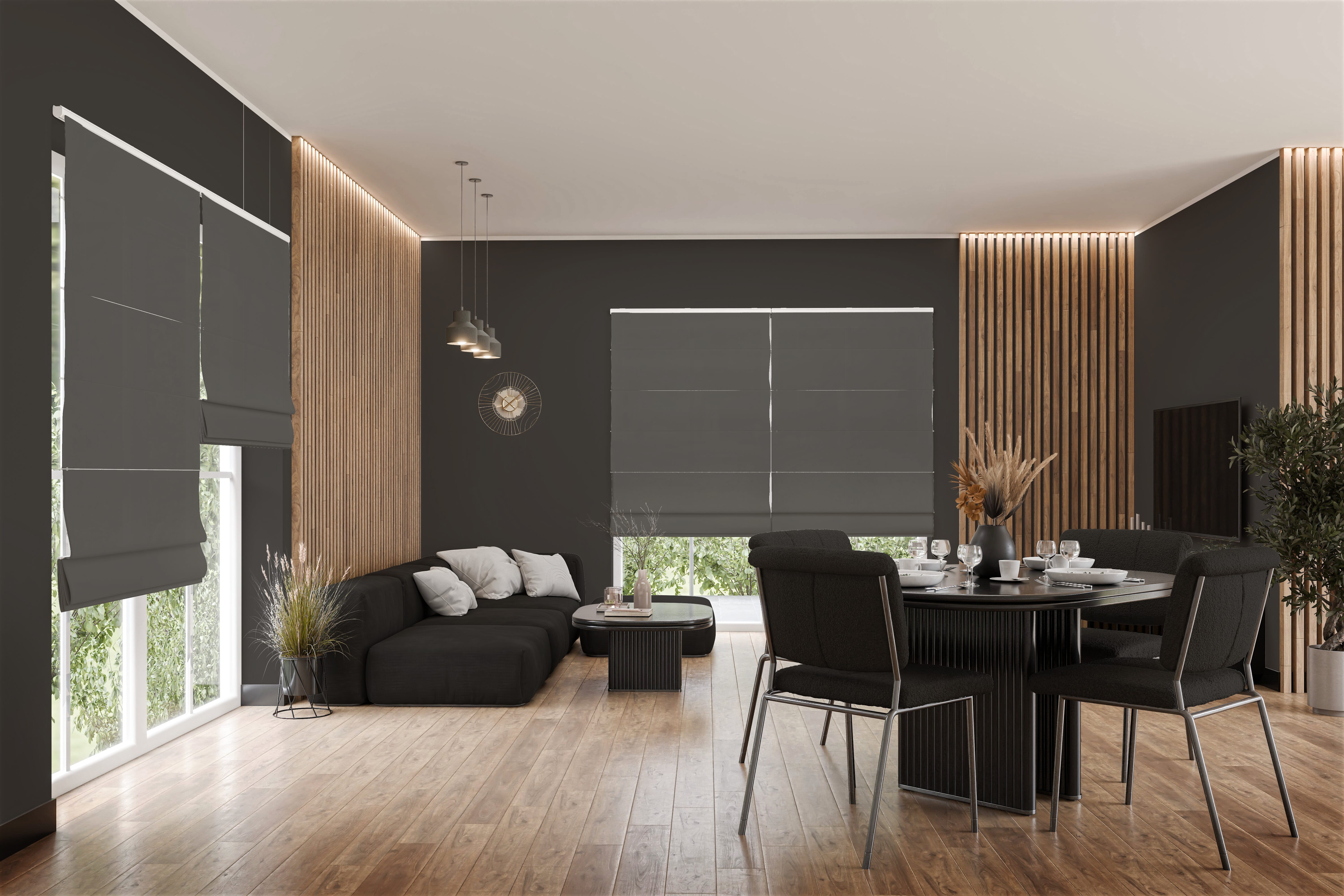 Das Raffrollo Tivario 9460 in dunklem Grau bringt Ruhe und Struktur in moderne Wohnräume. Die Farbgebung ist aufgrund ihrer klaren Ausdrucksstärke sehr beliebt und eignet sich besonders gut für minimalistische Einrichtungen, urbane Lofts oder Industrial-Stile. Die leicht glänzende, von feinen Weblinien geprägte Oberfläche verleiht dem Stoff eine edle Anmutung, die sich ebenso mühelos in elegant gestaltete oder klassisch konzipierte Umgebungen fügt. Möbel, Textilien und Dekorationen werden durch das lichtdurchlässige Material harmonisch betont, wobei neugierige Blicke trotzdem abgehalten werden. Das strapazierfähige Polyestergewebe ist nach ÖkoTex® zertifiziert, bei 30 °C waschbar und weist eine minimale Stoffschrumpfung von 1–2 % auf. Somit bleibt das maßgefertigte Raffrollo in Grau dauerhaft passgenau. Die seitliche Bedienkette erlaubt eine stufenlose Regulierung der Stoffhöhe ganz nach Lichtverhältnissen und persönlichem Bedarf. Die Stoffbahn wird dabei sorgfältig in gleichmäßige Falten gelegt, die eine plastische Wirkung entfalten und den Raum subtil beleben. Freuen Sie sich auf durchdachte Technik, hochwertige Verarbeitung sowie modernes Design und verleihen Sie Ihrem Zuhause ein ausgewogenes Lichtspiel mit stilvoller Wirkung.