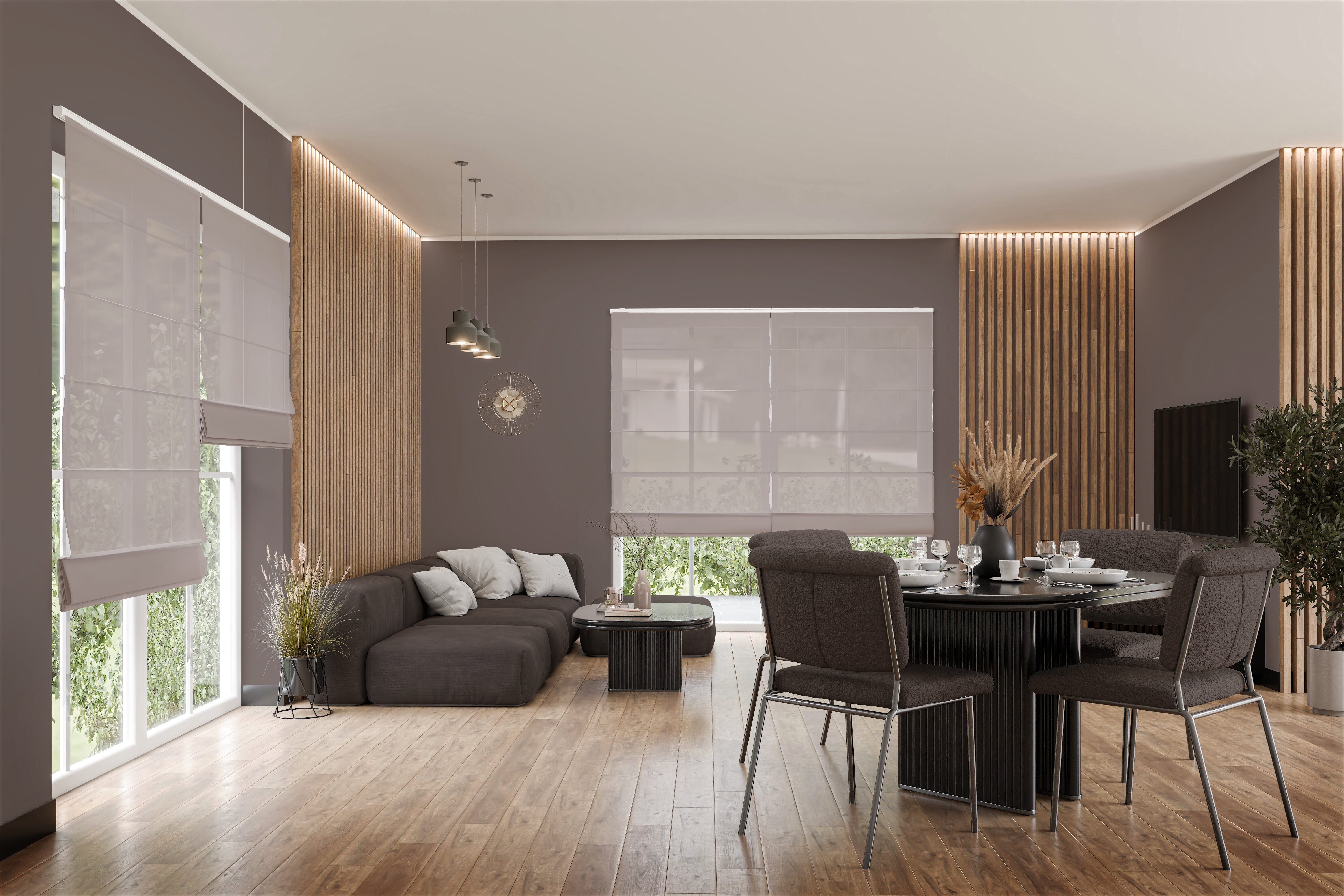 Der Stoff des Raffrollos Vivente 9339 weist braune und cremeweiße Fäden auf, wodurch ein sanfter, melierter Farbton entstanden ist. Er lässt sich hervorragend in warme Wohnkonzepte integrieren: beispielsweise in organisch-moderne Stile, rustikale Einrichtungen, sanft reduzierte Interieurs oder ruhige Mid-Century-Wohnkonzepte. Das Raffrollo in Braun wirkt erdverbunden und gleichzeitig zeitlos. Besonders gut macht es sich in einer Kombination zum Beispiel mit Nussbaumholz, Leder, Stoffsofas oder goldenen Akzenten. Es ist lichtdurchlässig und leicht durchsichtig, was sich besonders für Räume eignet, in denen Helligkeit und Offenheit erhalten bleiben sollen. Mit einem schönen Faltenwurf, der beim Hochziehen des Behangs entsteht, zeigt sich das Raffrollo modern und luftig locker. Damit macht es sich als perfekte Alternative zu klassischen Vorhängen – besonders in Räumen, in denen Leichtigkeit, klare Optik und gegebenenfalls Platzeinsparung gefragt sind. Für noch mehr Gemütlichkeit und Wohnlichkeit lassen sich beide Produkte jedoch ideal miteinander kombinieren. Das verleiht dem Fenster zusätzliche Tiefe, Struktur und eine harmonische Rahmung.