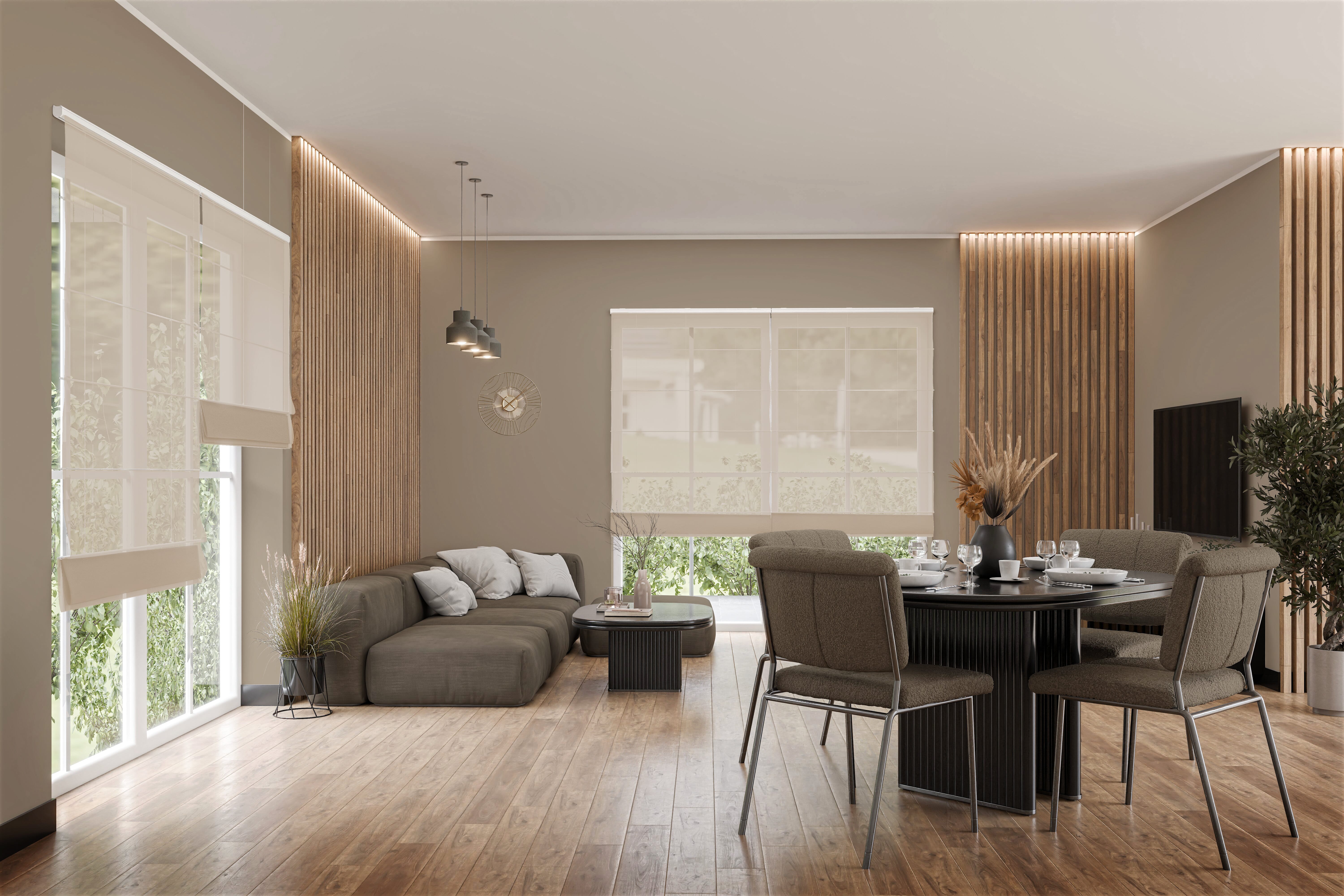 Das Raffrollo Zelari 9368 zeigt sich in einem klassischen, leicht melierten Beigeton, der zeitlos ist und sich vielseitig einsetzen lässt. Die Farbe vermittelt Ruhe und Wärme und bildet eine harmonische Verbindung zwischen Möbeln, Wandflächen und Dekoration. Das Raffrollo in Beige passt daher hervorragend zu modernen Wohnkonzepten, neutralen Farbpaletten oder Einrichtungen, die auf natürliche Akzente setzen. Dank seiner transparenten Qualität bleibt der Raum lichtdurchflutet und offen. Der Stoff besitzt eine angenehme Stabilität, wirkt aber gleichzeitig luftig. Zusammen mit den gleichmäßig gerafften Falten sorgt die Deko für einen unbeschwerten, edlen und hochwertigen Look am Fenster.